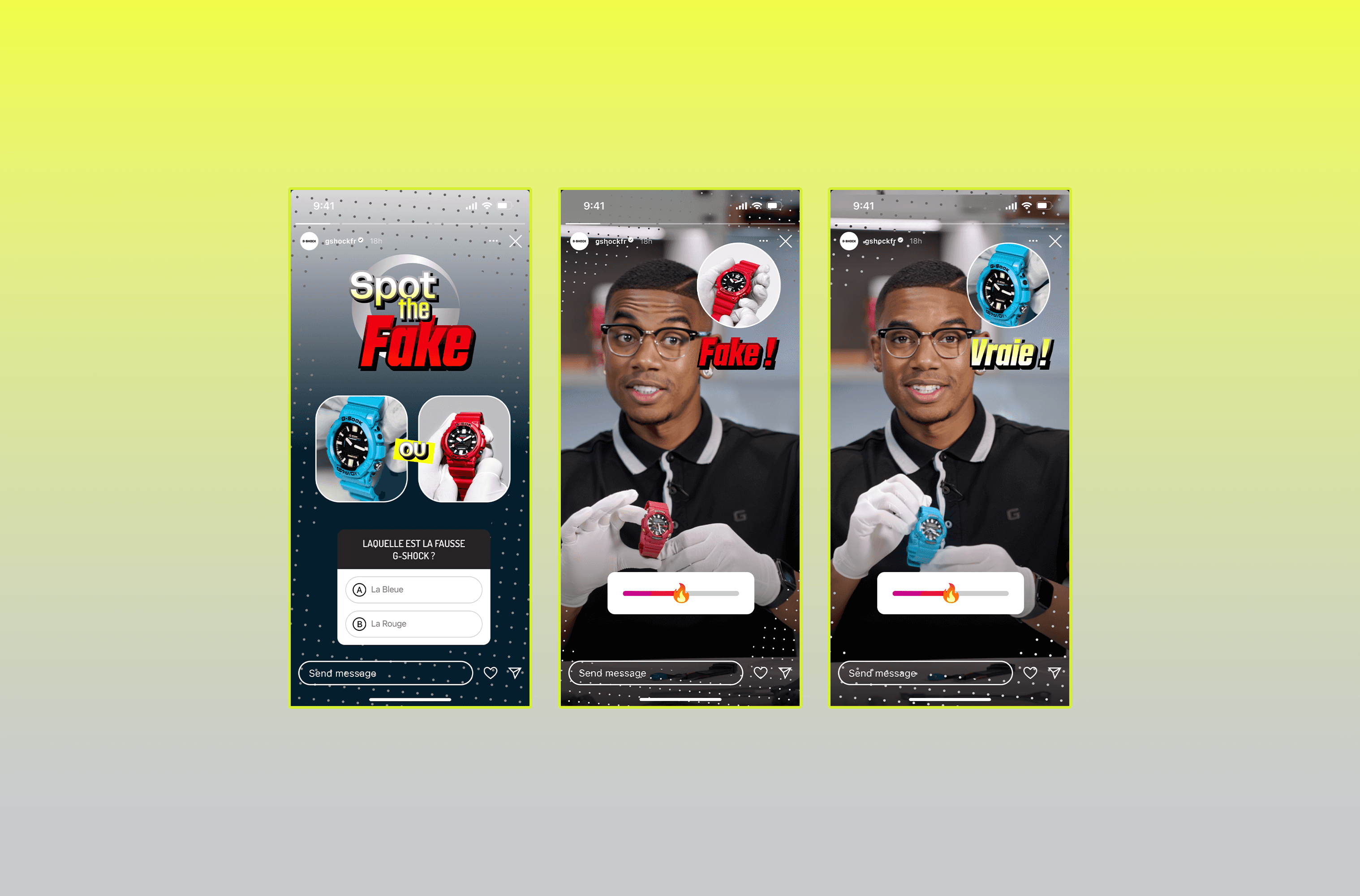Le dispositif intègre également une série de stories “Spot the Fake”, jouant sur l’interactivité et la pédagogie, afin de renforcer la sensibilisation du public sur les réseaux. L’ensemble du projet construit ainsi une approche visuelle osée et forte, déclinable sur des supports variés, allant du digital à l’activation physique.